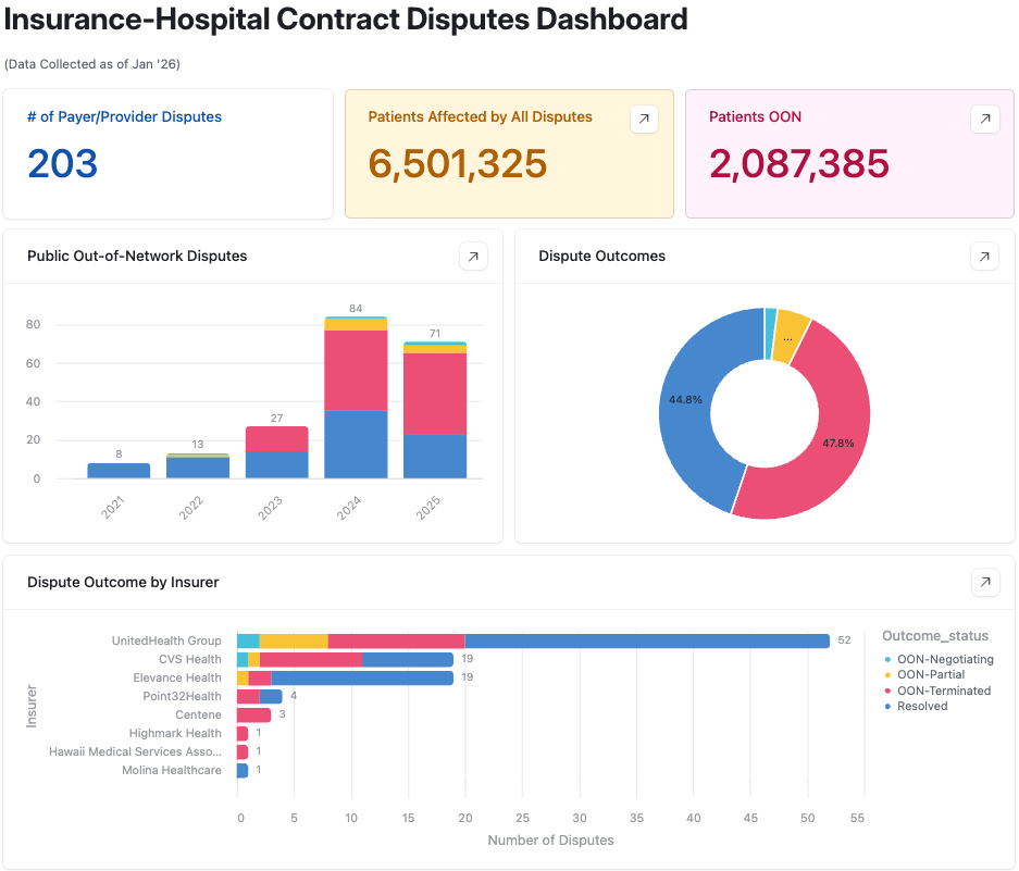 I’ve captured 200+ disputes so far, affecting over 6 million patients across 38 states. The data is messy — some disputes get national coverage; others I only find buried on page six of a regional business journal.