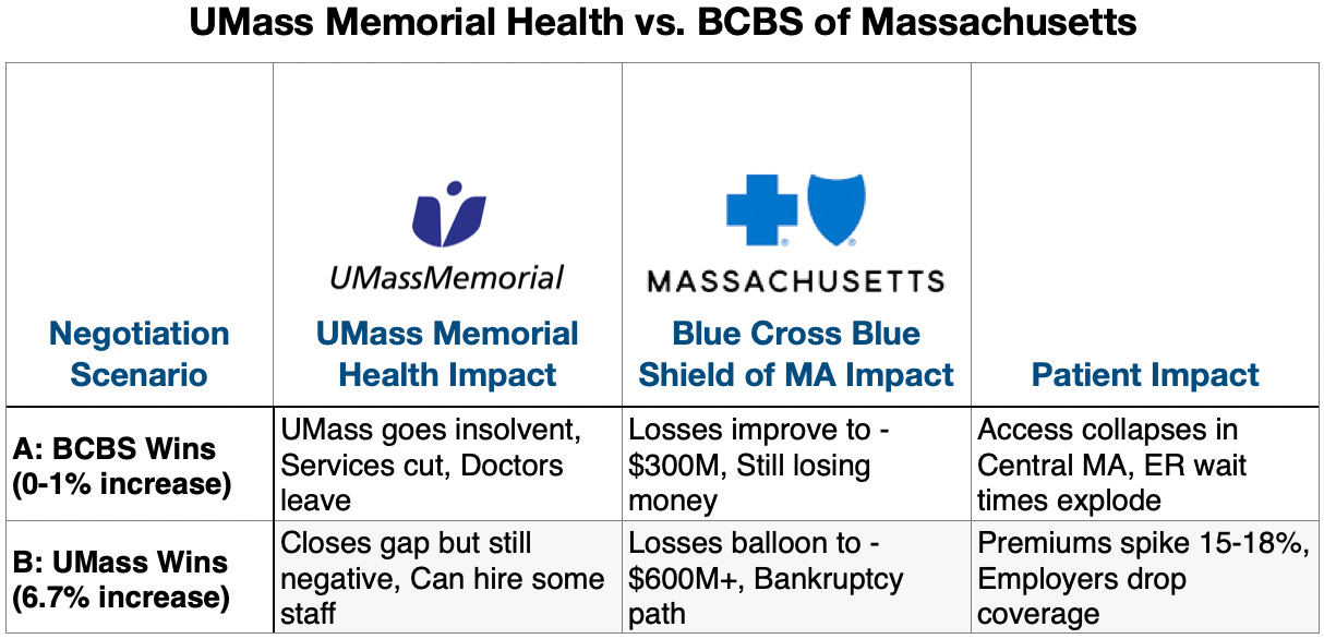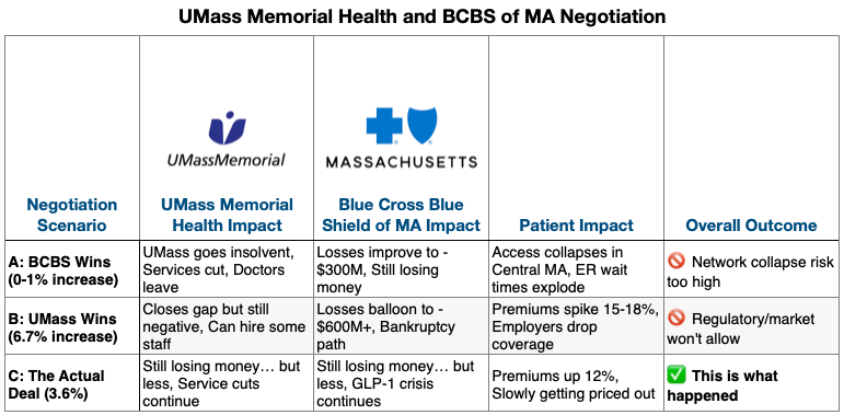 If Blue Cross held the line at 0-1%, UMass faced insolvency. The hospital cuts services, doctors leave, and the only trauma center in Central Mass starts to collapse. If UMass got everything they asked for, Blue Cross’s spiral toward bankruptcy and premiums spike 15-18% — employers start dropping coverage entirely.