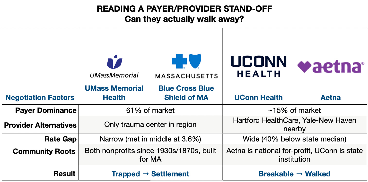 The case for UConn and Aetna follows the typical “he said, she said”: UConn wanted higher rates, but Aetna said those rates would drive up costs for employers. Neither budged and the contract expired, leaving 15,000 patients out-of-network.What was the difference from UMass/BCBS? UConn Health is a single academic center in a state dominated by Hartford HealthCare and Yale New Haven. Aetna had alternatives — Hartford Hospital, Yale, a dozen community hospitals happy to take the volume. When an insurer has options, losing one hospital is manageable. UConn didn’t have enough leverage to make walking away hurt. So Aetna walked. First Connecticut insurer/hospital dispute to extend past deadline in recent memory.